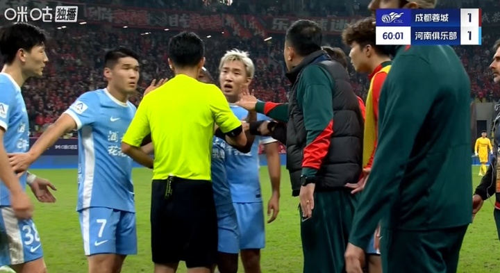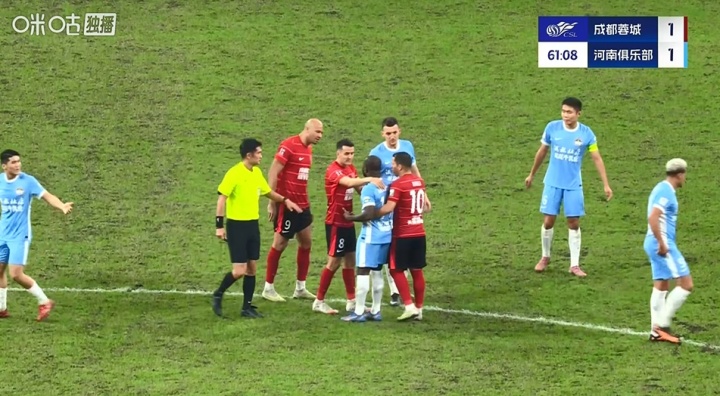 直播吧10月31日讯 河南2-1客胜蓉城,比赛下半场,阿奇姆彭一度情绪激动导致比赛中断。