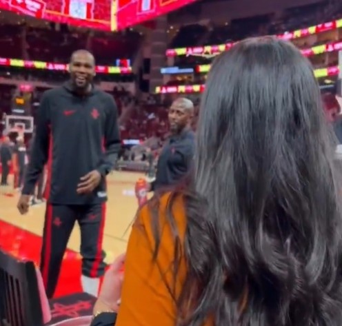 直播吧12月12日讯 火箭球星杜兰特在此前主场比赛赛前,在场边认出了自己大一的女同学,KD笑容满面并上前与其合影,