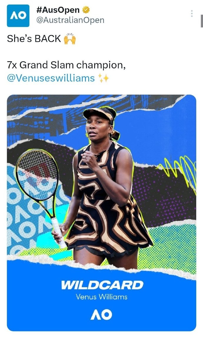 七座大满贯单打冠军得主!官方:45岁大威廉姆斯收获澳网外卡