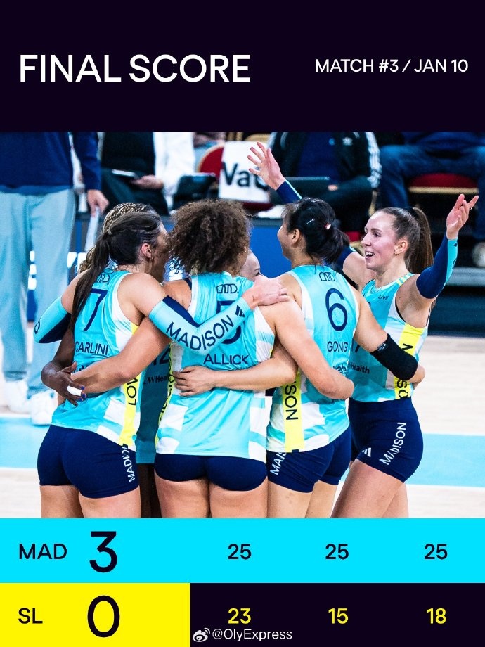 1月10日,美国LOVB女排联赛,麦迪逊3-0(25-23/25-15/25-18)击败盐湖城。