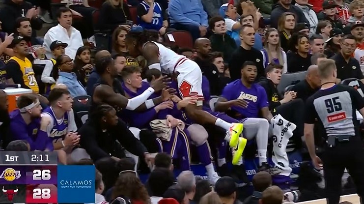 太拼了!道苏姆舍身救球 直接飞到湖人替补席里