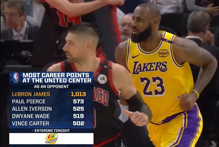 断档领先!作客芝加哥联合中心球馆 詹姆斯总得分1013高居榜首
