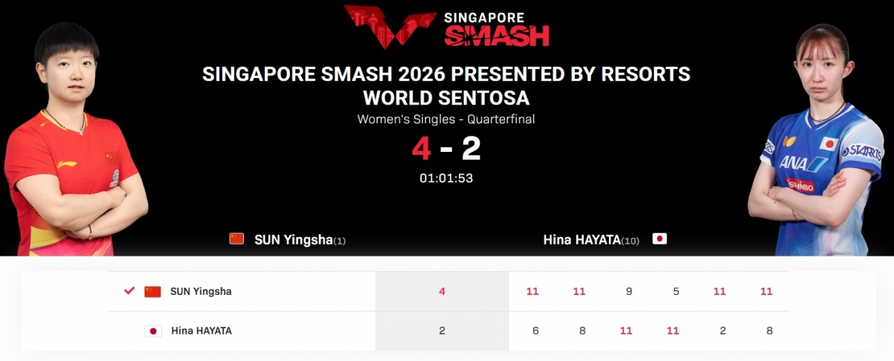WTT新加坡大满贯女单1/4决赛:孙颖莎4-2早田希娜,晋级四强