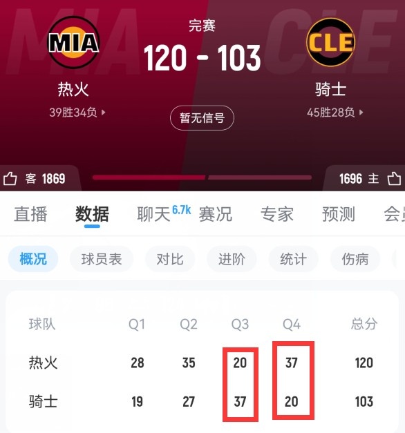 上半场热火领先17分,第三节骑士单节打出37-20追平比分,但第四节热火还了一个37-20,最终17分大胜。