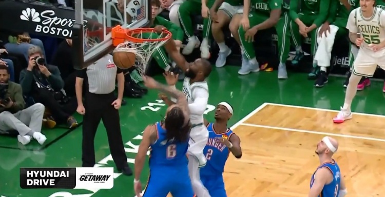 这身体这弹速!杰伦·布朗转身一步垫起 单臂隔扣杰林威!