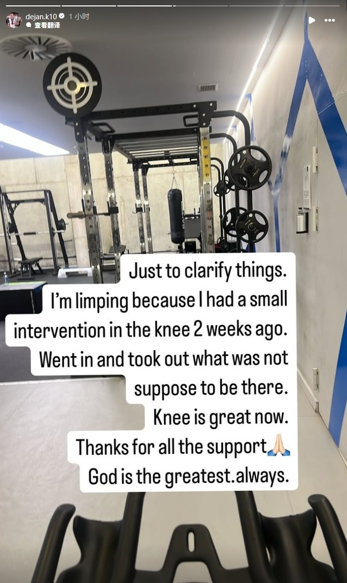 库卢写道:“澄清一下,我走路一瘸一拐是因为两周前膝盖进行了一次小手术。把里面不该有的东西取了出来,现在膝盖很好。”